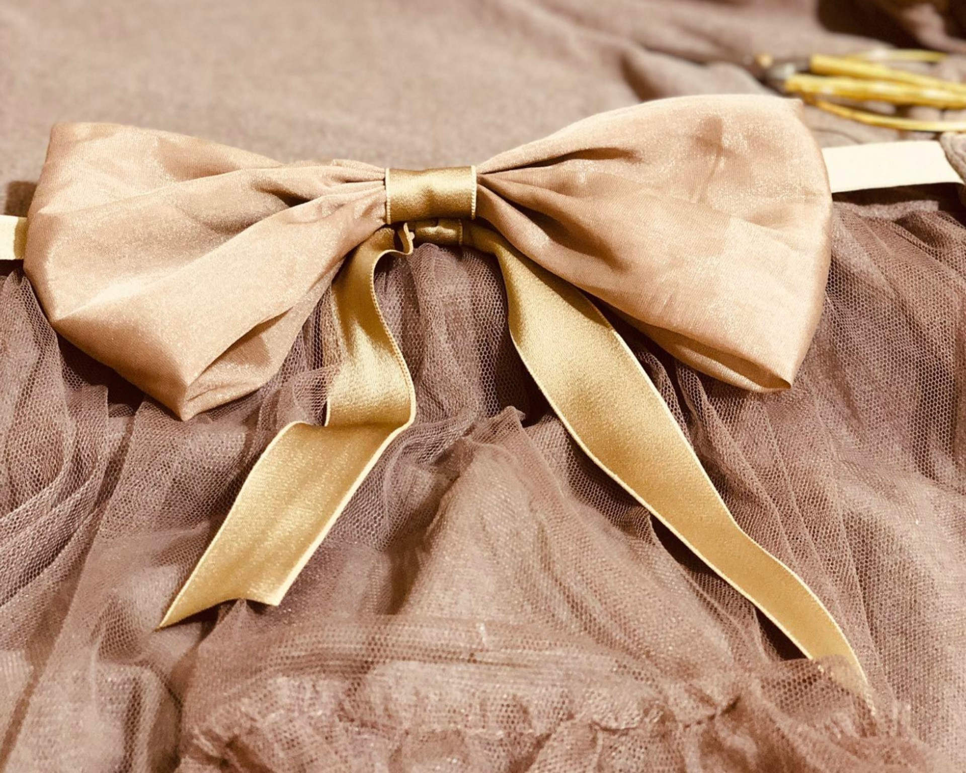 Lúc thấy chồng lục tìm vải, chị Hà hỏi thì mới biết anh đang tìm chất liệu làm chiếc nơ gắn thêm lên váy. Sau khi được đính chiếc nơ xinh xắn, váy cũ trở nên đẹp hơn rất nhiều.
