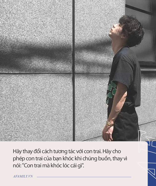 Hãy thay đổi cách tương tác với con trai. Hãy cho phép con trai của bạn khóc khi chúng buồn, thay vì nói: "Con trai mà khóc lóc cái gì"; hãy an ủi khi chúng bị thương, thay vì bắt chúng nghe câu nói: "Con là con trai, không sao đâu".