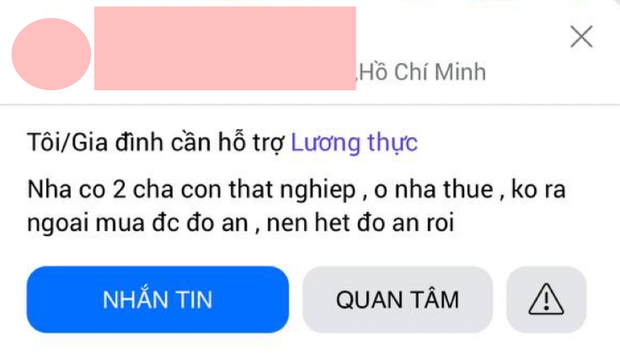Cụ thể, một người đàn ông đăng thông báo cần hỗ trợ lên ứng dụng Zalo, kèm theo đó là lời kêu cứu như sau: Nhà có 2 cha con thất nghiệp, ở nhà thuê, không ra ngoài mua được đồ ăn, nên hết đồ ăn rồi.