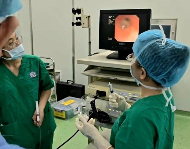 Để đánh giá chính xác tình trạng, bệnh nhi được chỉ định chụp CT ngực. Kết quả cho thấy dị vật có dạng hình ống, thành mỏng, nằm sâu tại phế quản thùy dưới bên trái, gây cản trở quá trình thông khí phổi. Trước diễn biến nguy hiểm, ê-kíp trực đã nhanh chóng hội chẩn và thống nhất chỉ định nội soi phế quản cấp cứu nhằm lấy dị vật ra ngoài.