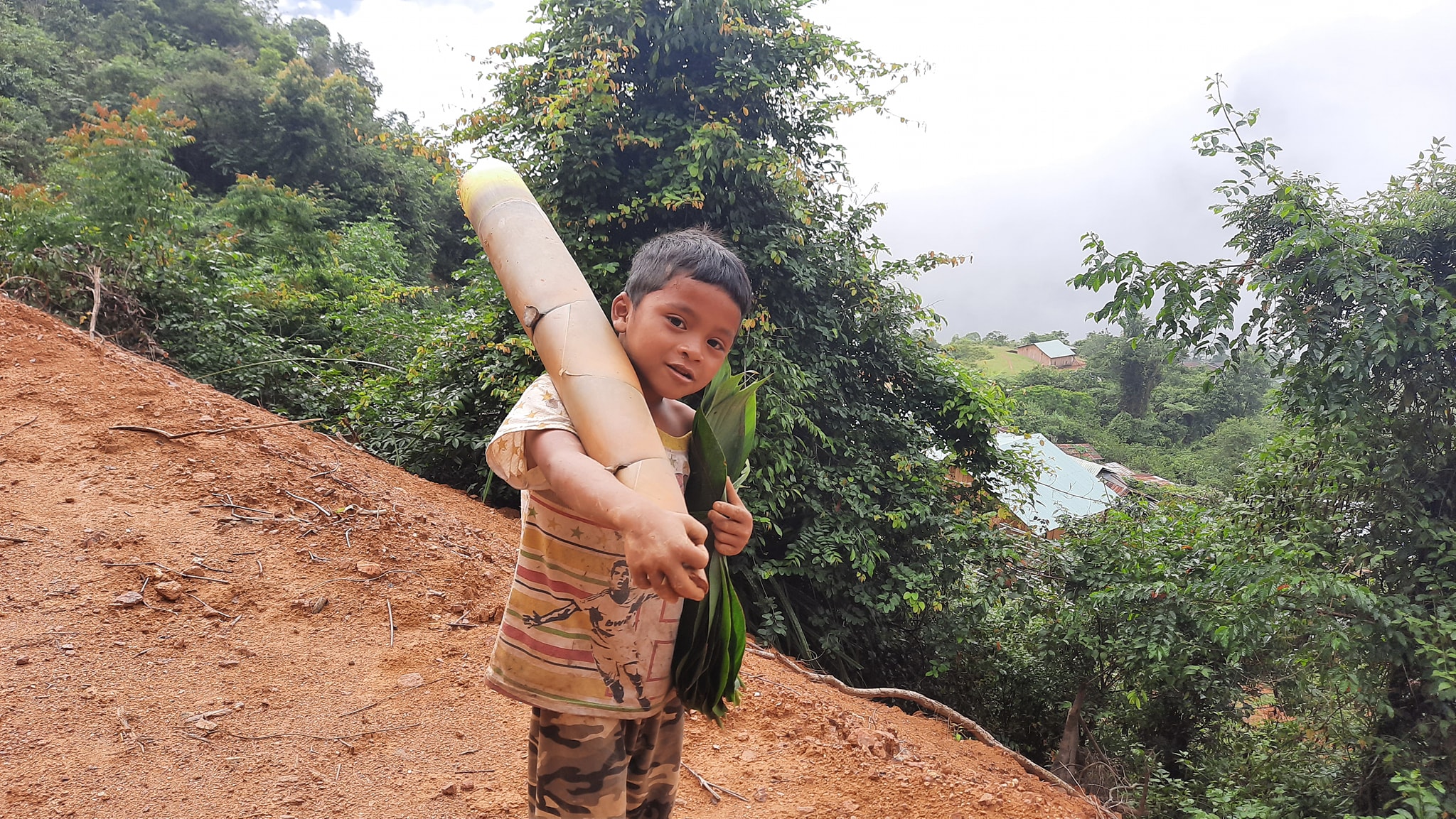 Đó là cảnh cậu bé lên 8 vác trên vai búp măng rừng cố vượt con dốc đất đỏ. Búp măng nặng và lớn hơn thân hình của em. Tay trái em cầm mớ lá dong xanh ngắt. Số hàng nàng em đã tự hái để đem đến hội trường thôn ủng hộ cho “người miền xuôi”.