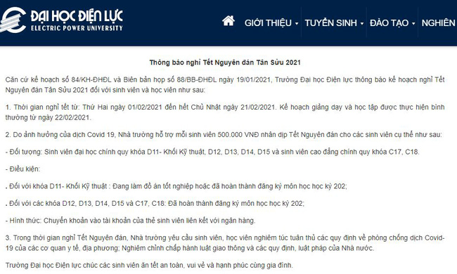 Hôm nay (20/1), Đại học Điện lực chính thức thông báo tới tất cả sinh viên và học viên lịch nghỉ Tết Nguyên đán Tân Sửu 2021.