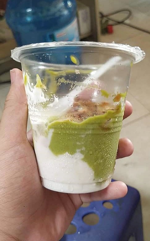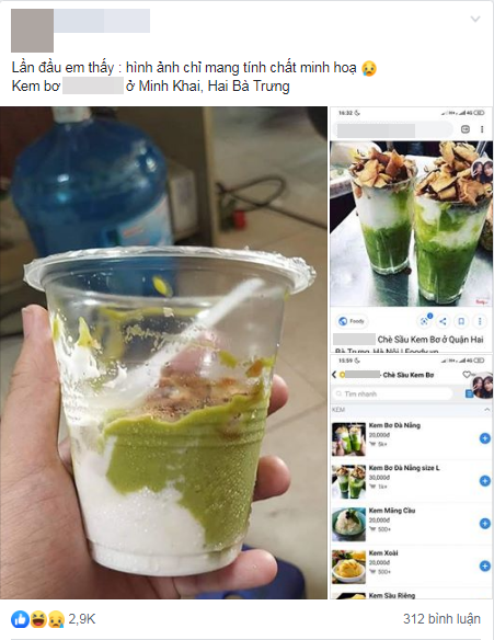 Quán mà N. đặt mua kem bơ khá nổi tiếng ở phố Minh Khai (quận Hai Bà Trưng, Hà Nội), nên ngay khi anh chàng lên mạng than thở dân tình đã nhận ngay ra địa chỉ. Thật buồn cho N. là thay vì nhận cốc kem bơ đầy ngập ngon lành, béo bùi thơm ngậy với đủ topping dừa khô, thì thanh niên kém may mắn lại nhận được thành phẩm như... ăn dở, đựng vào cốc nhựa, lại còn vơi chỉ bằng 1/3 ảnh quảng cáo.