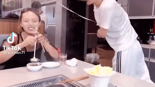 Một trong số ít lần các nhân viên múa mì gây ra "lỗi tày trời" chính là: quấn luôn cả vào cổ thực khách, kéo văng cả kính. Rất may có vẻ như anh đầu bếp khá đẹp trai nên đã được nữ thực khách này bỏ qua.