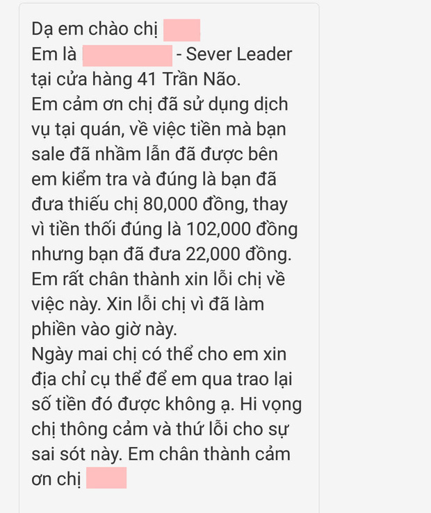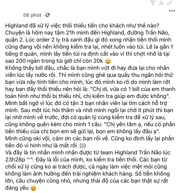 Theo đó, cô nàng N.N và bạn mình đã ghé Highlands chi nhánh Quận 2, TP. Hồ Chí Minh để mua 2 ly matcha đậu đỏ. Khi thanh toán, N.N đưa tờ 200k, một lúc sau chỉ thấy trong túi còn 20k nên cô nàng nghĩ rằng nhân viên thối thiếu tiền. Khi hỏi nhân viên Highlands, 3 nhân viên trong quán đều tích cực hỗ trợ, nhờ N.N về trước và nói: Chị yên tâm ạ, nếu có phần tiền thiếu của chị bọn em sẽ gửi lại, bọn em không lấy đâu ạ.