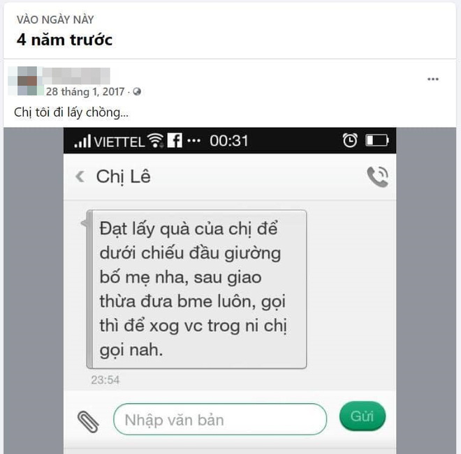 "Đạt lấy quà của chị để dưới chiếu đầu giường bố mẹ nha. Sau Giao thừa đưa bố mẹ luôn, xong việc trong này chị gọi", cô chị nhắn qua điện thoại.