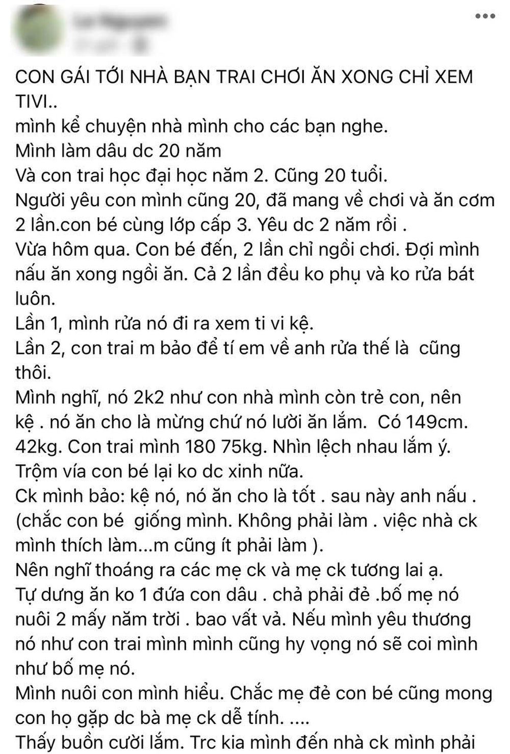 Cụ thể, một vị phụ huynh có tên tài khoản Facebook là L.N. đã chia sẻ câu chuyện về cô "con dâu tương lai" của mình và thu hút đông đảo sự chú ý của mọi người. Nguyên văn chia sẻ của chị L.N. như sau: