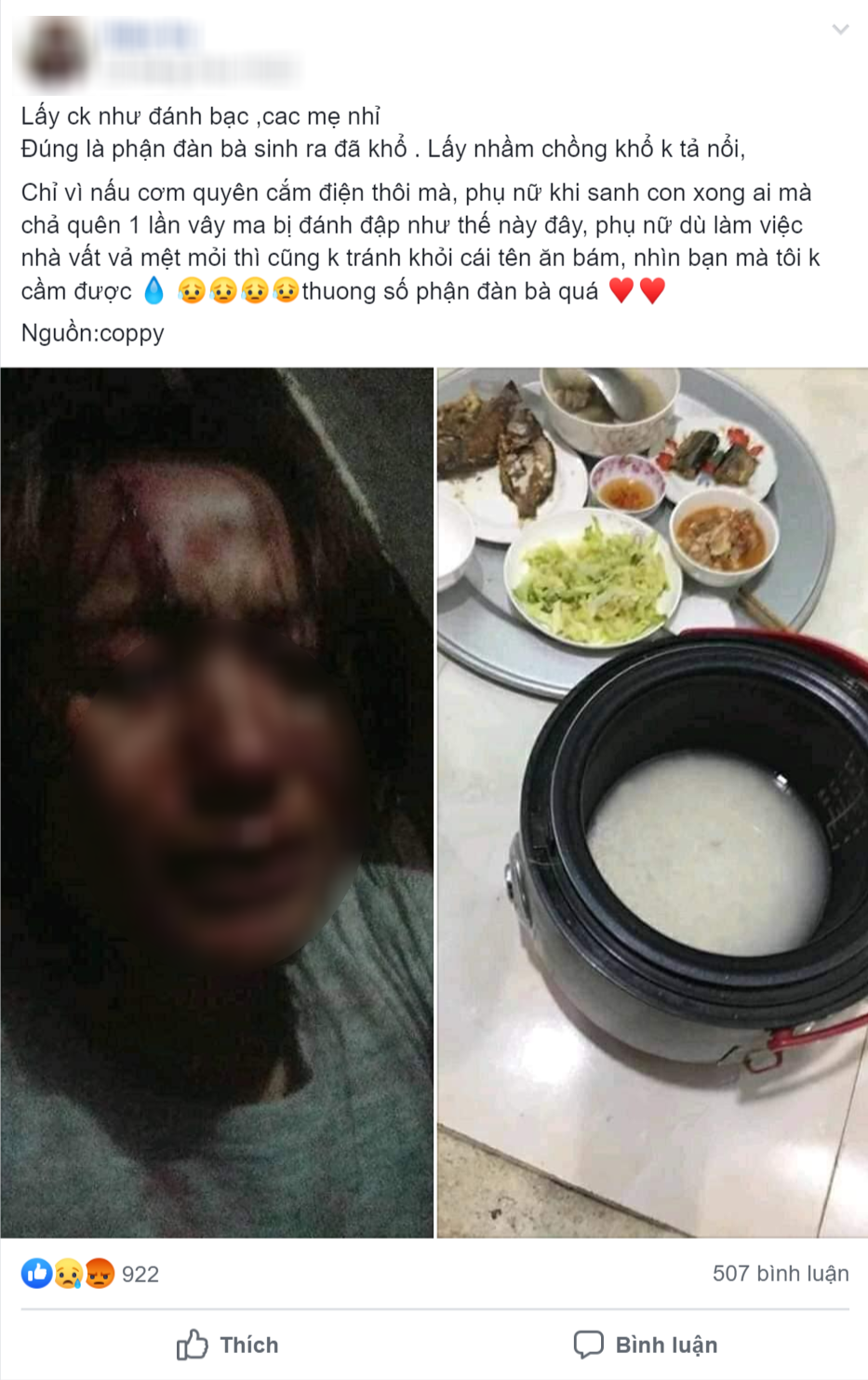Chỉ vì nấu cơm quên cắm điện thôi mà! Phụ nữ khi sinh con xong ai mà chả quên 1 lần. Vậy mà bị đánh đập như thế này đây. Phụ nữ dù làm việc nhà vất vả mệt mỏi thì cũng không tránh khỏi cái tên ăn bám, nhìn bạn mà tôi không cầm được nước mắt. Thương số phận đàn bà quá!"