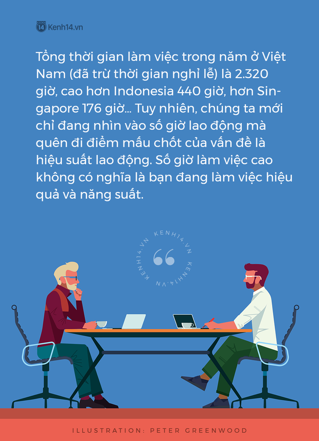 Chị Thu Đông, hiện đang là giám đốc quản lý một công ty tư nhân lại có một góc nhìn khác về vấn đề này: “Số giờ làm việc nhiều có thể còn phản ánh sự yếu kém của ban điều hành chứ không phải nói lên sức làm việc của nhân viên. Ví dụ khi bạn giao một công việc cho nhân viên của mình nộp lại vào ngày 10 thì đúng ngày 10 họ mới nộp lại, đó là một kiểu đi làm đếm thời gian trôi chứ chưa thực sự chú tâm vào việc làm sao để nộp lại sớm hơn. Tôi cũng đã từng hợp tác với một số kĩ sư ở Nhật, nếu như các kĩ sư Việt Nam mất 4 tuần để làm việc thì kĩ sư ở Nhật chỉ mất có 12 ngày để hoàn thành.”
