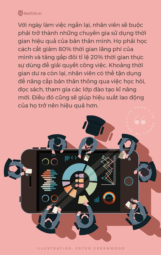 Anh Tiến Đạt - trưởng phòng kế toán, nói rằng ngay khi nhân viên của mình đọc được bài báo, họ đều gửi cho anh như một lời nhắc nhở nhẹ rằng tại sao công ty chúng ta không như vậy nhỉ? Anh Đạt lại thấy niềm tin của mình vào nhân viên lại lung lay khi họ chưa thực sự hiểu rõ bản chất vấn đề, mới chỉ chăm chăm nhìn vào việc chỉ còn bốn ngày làm việc, chứ không tập trung còn con số hiệu suất lao động tăng 40% kia.