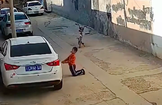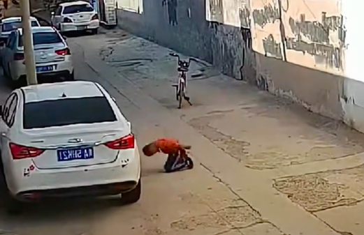 Sau cú đâm mạnh, cậu bé ngã nhào ra đất. Thời điểm xảy ra sự việc, xung quanh không có ai. Sau khi dứng dậy và dựng xe đạp xong, cậu bé quay lại nhìn chiếc xe mình vừa đâm rồi quỳ xuống vái đúng 3 lạy dứt khoát trước chiếc xe ô tô, tỏ vẻ ăn năn, hối lối về cú đâm vừa rồi.