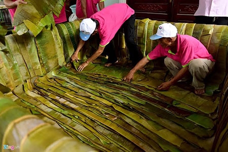 | Hai người đàn ông đi chân không trong khuôn làm bánh để xếp lá (Nguồn ảnh: Zing). |