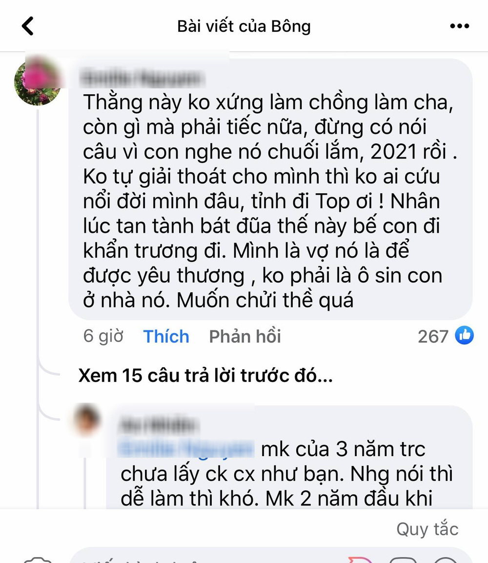 "Chồng quá tệ, chỉ đáng vứt đi chứ còn nuối tiếc gì nữa. Tranh thủ anh ta đang phá phách nhà cửa tan hoàn thế thì hãy mạnh mẽ mà bế con đi bạn ơi, lựa chọn một con đường khác. Bây giờ mình không tự cứu lấy mình thì không ai cứu được đâu!"