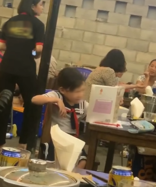 Bố thì ngồi "chém gió" với đồng nghiệp còn cô con gái ngồi đối diện lvẫn mặc quần áo đồng phục, cổ đeo khăn quàng đỏ, tay đang cầm quyển sách cố gắng học bài, không gian xung quanh thì khá náo nhiệt và ồn ào. Quả là hình ảnh hiếm có khiến không ít người xung quanh tò mò và giơ máy lên quay lại.