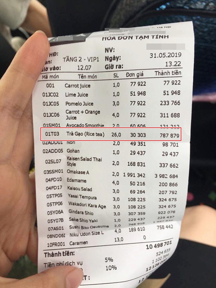 Đã nói đến đây thì hay ta lục lại chuyện xưa một chút nhỉ. Lúc trước, có nhóm khách đi ăn sushi ở quán gì đó tên N. nổi tiếng ở Hà Nội chẳng phải là cũng than thở chuyện giá cả hay sao. Cả nhóm có 12 người thanh toán hóa đơn 12 triệu, trong đó đã có gần 1 triệu tiền trà đá, mà cụ thể là trà gạo rang của Nhật Bản. Người này chia sẻ là trong suốt bữa ăn, các em nhân viên cứ liên tục tự động làm đầy các cốc nước của khách khi vơi mà không hỏi là khách có muốn dùng thêm nữa hay không. Chính sự nhiệt tình này của các em phục vụ kết hợp với sự "ngây thơ, tưởng bở" là miễn phí của khách mà số tiền mới đội lên chóng mặt.
