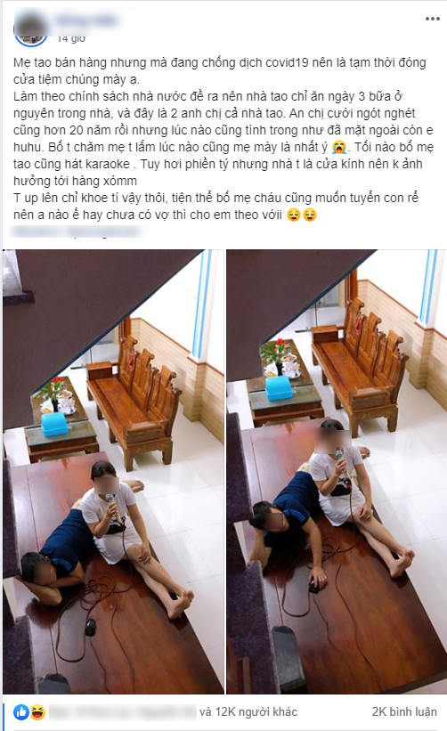 "Đây là cách 2 "anh chị cả" nhà mình ở nhà. Anh chị đã cưới ngót nghét cũng được 20 năm rồi nhưng lúc nào cũng "tình trong như đã mặt ngoài còn e". Bố tôi chăm mẹ tôi lắm, lúc nào cũng mẹ mày là nhất ý. Tối nào bố mẹ cũng hát karaoke. Tuy hơi phiền tí nhưng nhà tôi là cửa kính nên không ảnh hưởng đến hàng xóm. Tôi chỉ đăng lên khoe vậy thôi".
