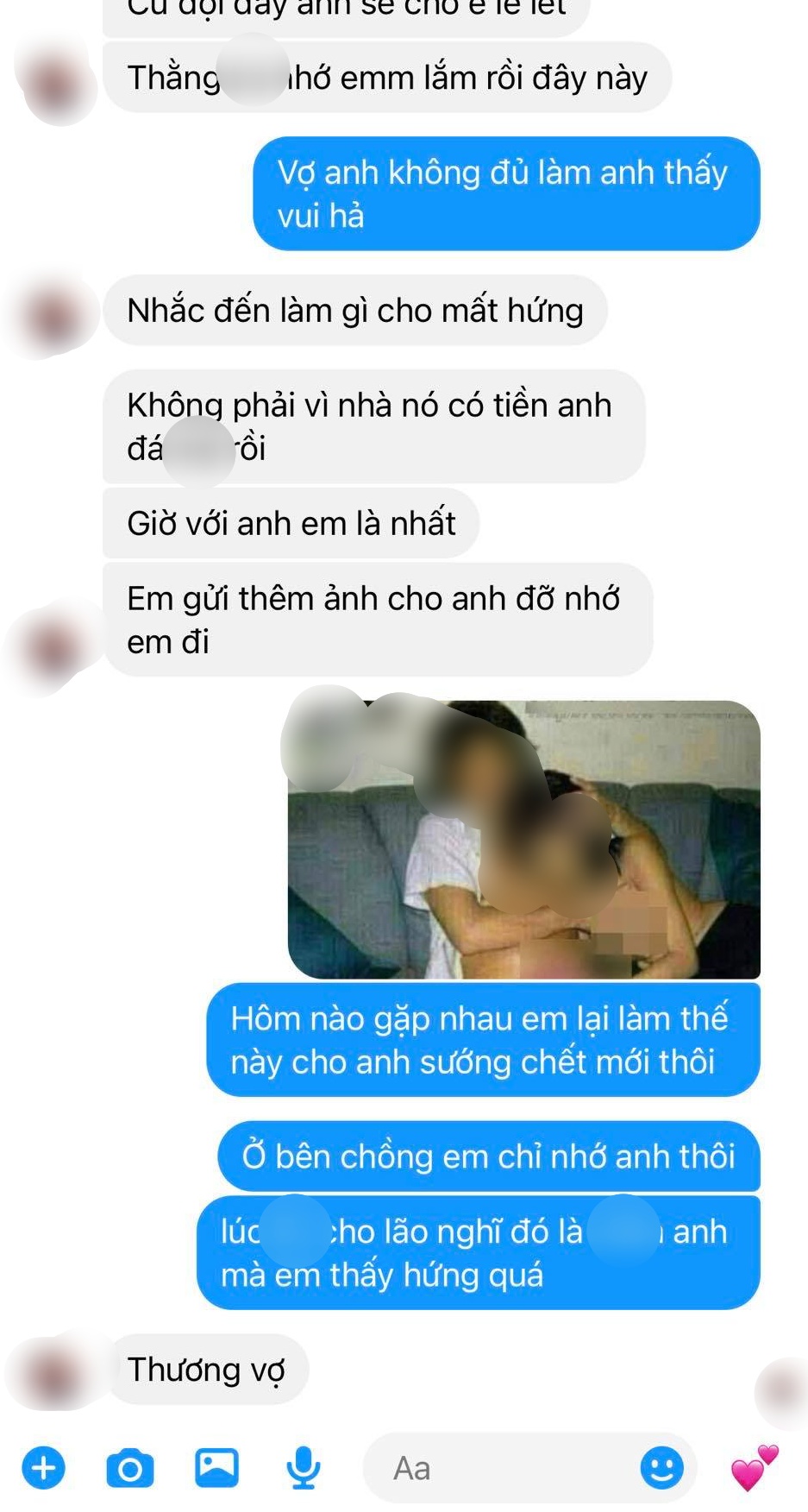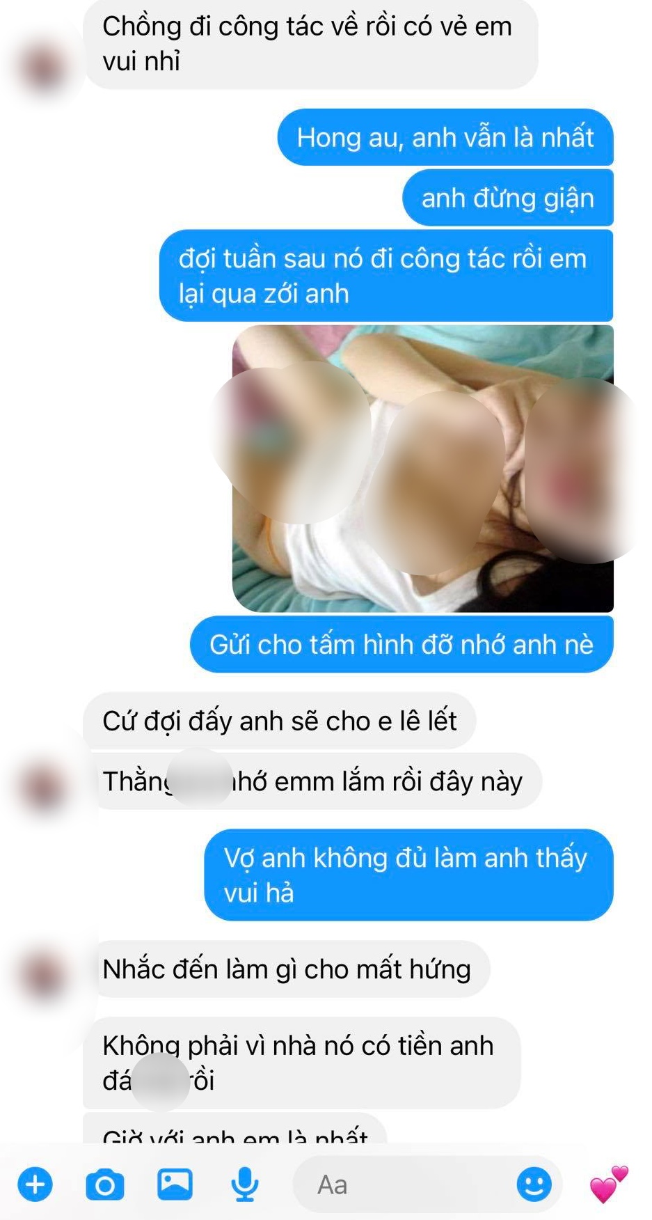 Được biết, ông chồng và cô nhân tình suốt ngày nhắn tin, gửi hình ảnh nhạy cảm cho nhau. Thậm chí, người chồng còn tuyên bố “Đêm nào anh cũng chỉ thèm mỗi em” khiến người vợ điên tiết.