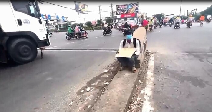 Mới đây, mạng xã hội xuất hiện đoạn clip ghi lại cảnh một nam thanh niên đội mũ lưỡi trai, mặc áo sơ mi, mặc quần jeans, đi dép tổ ong và đeo balo đang ngồi ở ngã tư đường, nơi có tấp nập người qua lại. Trên tay anh là một tấm biển ghi dòng chữ: “Xin cô bác, anh chị giúp đỡ chút tiền xe về quê”.