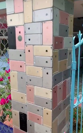 Trong đoạn clip ghi lại cho thấy, thay vì thiết kế bằng gạch hay ốp đá thông thường, chủ nhân ngôi nhà này đã... ốp hẳn cổng bằng Iphone để thay thế. Nhìn chiếc cổng dài rộng với hàng trăm vỏ Iphone được ghép lại tỉ mỉ với nhau khiến ai nấy cực kì thích thú.