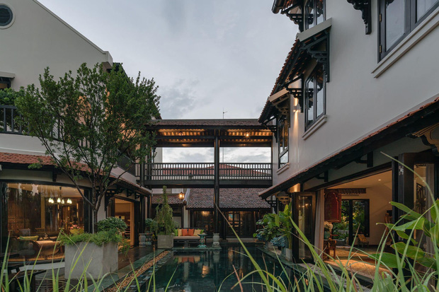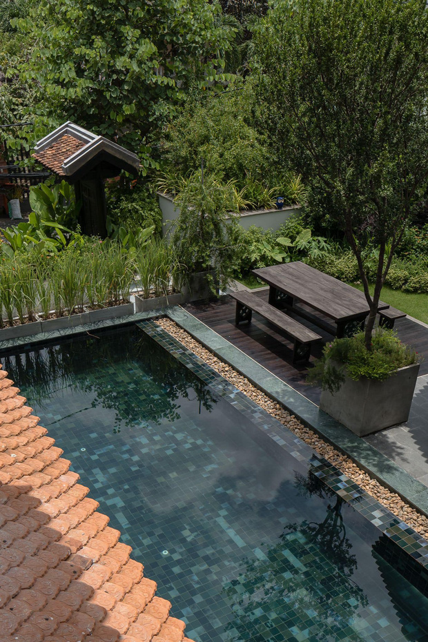 Chính vì vậy, KTS phải thiết kế lại bằng cách cho nâng các cao độ lên bằng nhau – tạo thành hình chữ U với không gian hồ bơi sân vườn ở giữa (cách bố trí này được KTS học hỏi theo layout của người Hy Lạp cổ, người Hoa và nhà truyền thống của người Việt). Sau khi hoàn thành, ngôi nhà vẫn giữ được nét cổ kính nhưng đồng thời cũng rất sang trọng, hợp thời đại.