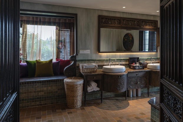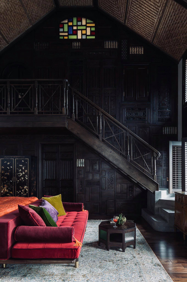 Phòng ngủ được thiết kế với gam màu tối, sử dụng vật liệu gỗ truyền thống cùng những chi tiết trang trí hoa văn tỉ mỉ. Phía trên trần nhà còn được lót một lớp vật liệu đan lát thủ công, điều này giúp sự cách nhiệt thêm hiệu quả và làm thoáng mát hơn cho căn phòng. Điểm nhấn nổi bật của phòng ngủ là chiếc giường màu đỏ đậm, cùng ô cửa sổ kính màu.