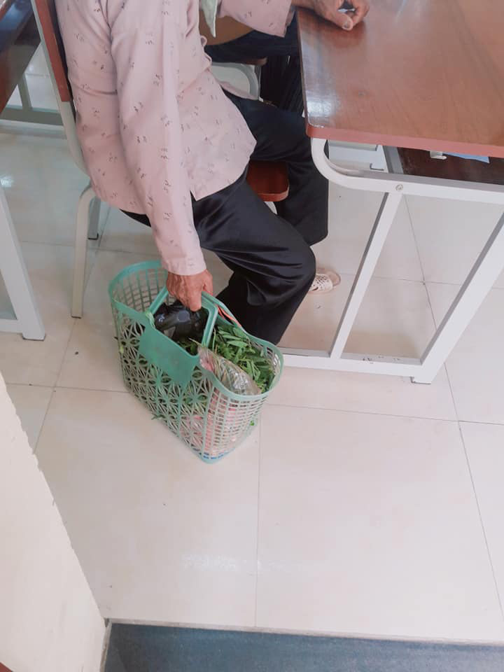 Trong chiếc giỏ nhựa này đựng đầy ắp rau củ, thịt thà mà có lẽ bà mới đi dạo một vòng chợ và mua về để chuẩn bị bữa trưa cho cả nhà. Nhưng có lẽ vì vô tình trùng hợp giờ họp phụ huynh của cháu mà bà đã mang luôn chiếc giỏ này đến lớp.