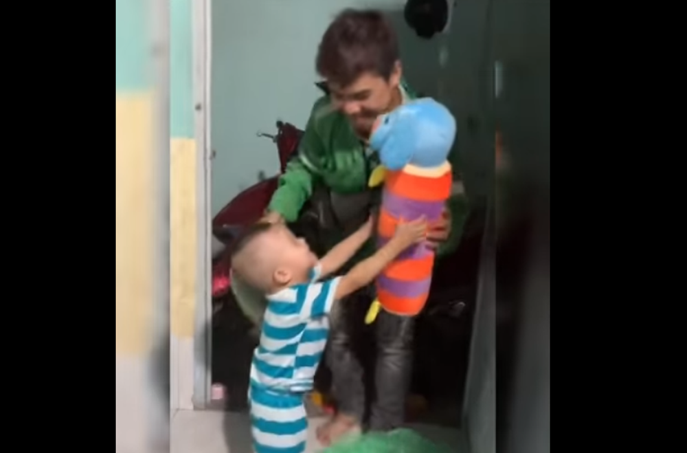 Theo đó, người đàn ông vừa đi làm về, một tay anh xách quả dưa hấu rất to, tay kia ôm thú bông. Thấy bố, cậu con trai hớn hở ra đón tận cửa. Chứng kiến món đồ chơi mới trên tay bố, cậu bé tỏ ra vô cùng phấn khích, giơ hẳn 2 tay lên để xin. Ngay lập tức người bố ôm con trai vào lòng và đưa cho cậu bé ôm món quà. Cậu bé sung sướng cười toe và thơm má bố nhiều lần. Ông bố cũng rất vui vì đã mua cho con trai được món quà mà anh đã hứa trước đó.