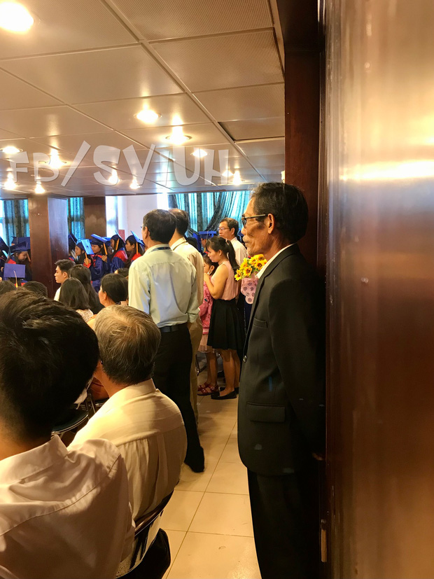 Trên fanpage của trường Đại học Công nghiệp TP.HCM mới đây đã đăng tải một hình ảnh xúc động được ghi lại trong buổi lễ tốt nghiệp của các sinh viên. Một vị người đàn ông trung niên mặc áo vest chỉnh tề, nép ở phía cuối hội trường và chăm chú theo dõi buổi lễ. Bộ vest màu xám được ủi thẳng thớm, nhìn mới tinh này đã gây chú ý tới người đã chụp lại bức ảnh. Theo chú thích từ trang đăng tải, đây là một ông bố đến dự lễ tốt nghiệp của con gái út.