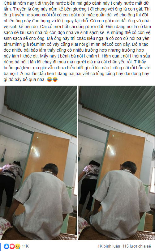 "Chả là hôm nay tôi đi truyền nước biển mà gặp cảnh này tôi chảy nước mắt dữ lắm. Chuyện là ông này nằm kế bên giường tôi đi chung với ông là con gái thì phải. Ông ốm cũng phải truyền nước, xong xuôi rồi cô con gái mới mặc quần dài vô cho ông thì đột nhiên ông này đau bụng và lỡ đi nặng ngay tại chỗ (người già ốm đau hay mất kiểm soát hành động).