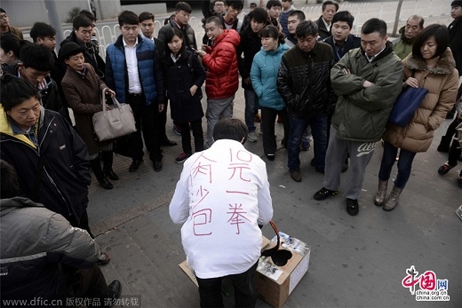 Ngày 28 tháng 11 năm 2014, một khung cảnh kỳ lạ nhưng đầy ám ảnh đã diễn ra ngay tại một cửa ga tàu điện ngầm quốc tế Bắc Kinh, Trung Quốc. Giữa dòng người hối hả, một người đàn ông trạc 30 tuổi, với dáng vẻ gầy gò, đứng đó với chiếc áo thun trắng có dòng chữ lớn gây sốc: "Bao cát thịt người, 10 tệ (gần 35.000đ) một cú đấm".