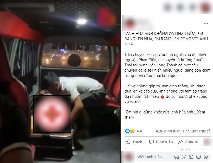 10/08/2022 17:17Người đàn ông ôm vợ khóc lóc trên xe cấp cứu: 'Anh hứa sẽ không nhậu nữa, anh sai rồi! Em ráng lên sống với anh nha!