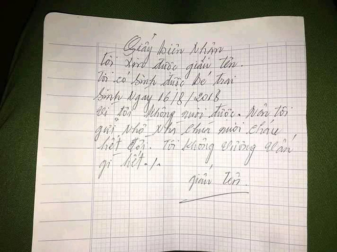 Tôi xin được giấu tên. Tôi có sinh được bé trai ngày 16/8/2018. Vì tôi không nuôi được nên tôi gửi nhờ xin nhà chùa nuôi cháu hết đời. Tôi không vương vấn gì hết".