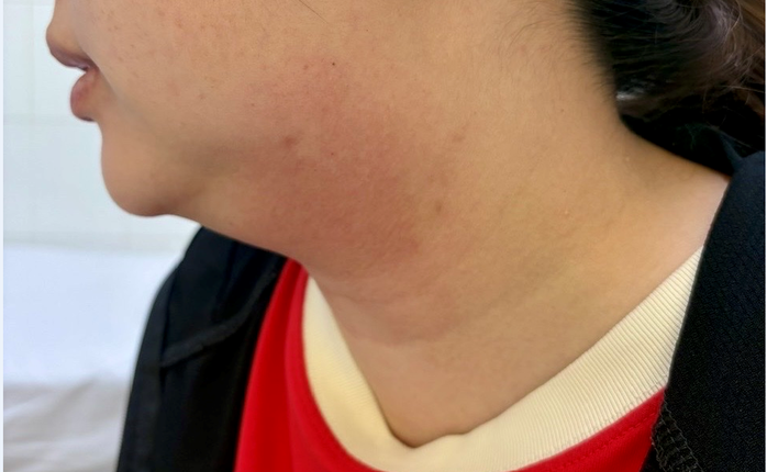 Đến sáng hôm sau, vùng cổ và dưới cằm bắt đầu sưng nề, đỏ da rõ rệt, đau tăng khi chạm vào và có dấu hiệu khó thở, nên bà N. được người nhà cấp tốc đưa đến cấp cứu tại Bệnh viện Hoàn Mỹ Cửu Long.