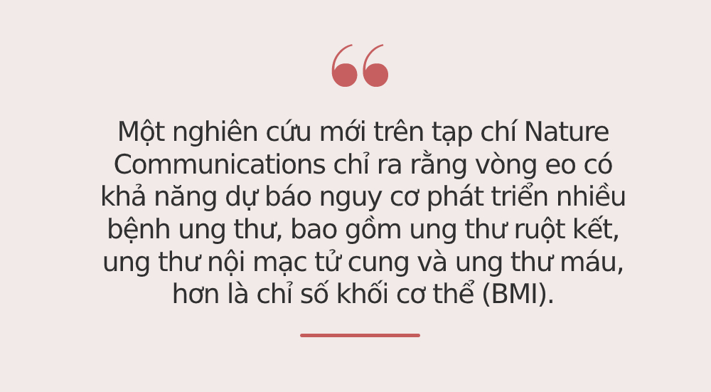 Ngoài ra, một nghiên cứu mới trên tạp chí Nature Communications cũng chỉ ra rằng vòng eo có khả năng dự báo nguy cơ phát triển nhiều bệnh ung thư, bao gồm ung thư ruột kết, ung thư nội mạc tử cung và ung thư máu, hơn là chỉ số khối cơ thể (BMI).