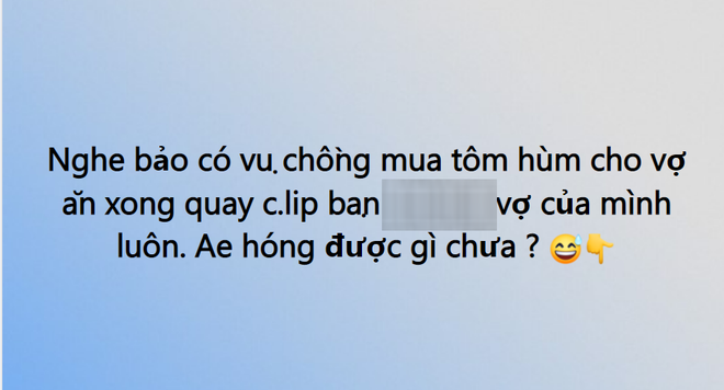 Không rõ thực hư câu chuyện cụ thể ra sao, chỉ có 1 thông tin duy nhất là chồng mua tôm hùm tặng vợ rồi quay clip quan hệ tình dục của vợ với bạn mình. Dưới bài đăng có rất nhiều bình luận chia sẻ về chủ nhân của 2 con tôm hùm oan nghiệt kia. Đáng nói, 10 comment thì có đến 9 cái với mục đích xin link.