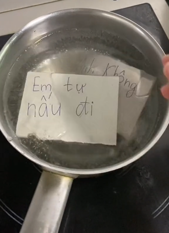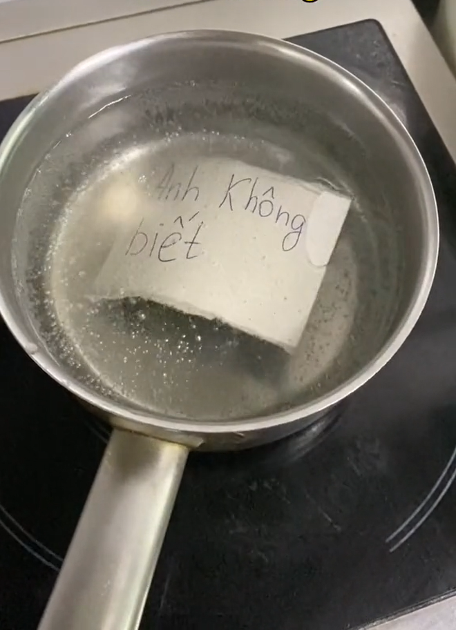 Chủ nhân clip cũng đã gặp trường hợp này không ít lần nên cuối cùng cô đã quyết "dằn mặt" anh người yêu bằng một chiếc nồi đầy nước và các "nguyên liệu" đảm bảo đúng ý anh, gồm có: "Anh không biết", "Em tự nấu đi" và "Ăn gì cũng được". Tất cả đều được ghi lên giấy rất to, rõ ràng và thả vào nồi nước đang sôi lăn tăn.
