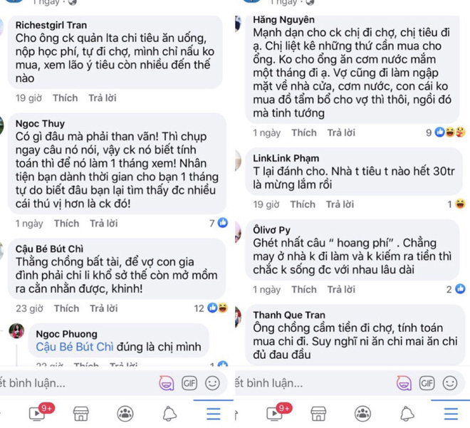 Đa phần các ý kiến đều khuyên chị T.N nên thử để chồng quản lý chi tiêu một tháng, vừa tính toán, vừa tự cầm tiền đi chợ, mua bỉm sữa, đóng học phí cho con... để xem anh ta sẽ xoay sở như thế nào với cùng một khoản tiền ấy.