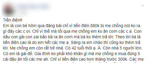 "Theo lời bà thì tiền điện cao là do em hết các mẹ ạ. Sáng ra em chào cũng không thèm trả lời. Nhà có 5 người lớn, có em là gái đẻ mà mẹ chồng em mua đúng 5 cái đậu ăn tối các mẹ ạ. Chỉ vì tiền điện cao hơn tháng trước 300k..." - Chị C. kể thêm.