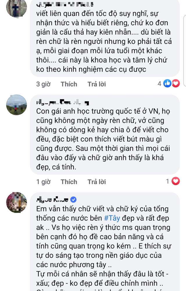 "Ở nước ngoài không ai khuyến khích các con thói cẩu thả, nhưng không cần thiết bắt trẻ mất thời gian trong việc luyện chữ. Thời gian đó để làm những việc sáng tạo hơn, cắt, dán, vẽ, đọc sách, âm nhạc, thể thao, hay đơn giản để thời gian cho các con vui chơi. Nên coi trọng thông điệp, sự sáng tạo trong bài viết của các con, thay vì "nhan sắc" của chữ", một phụ huynh nhận xét.