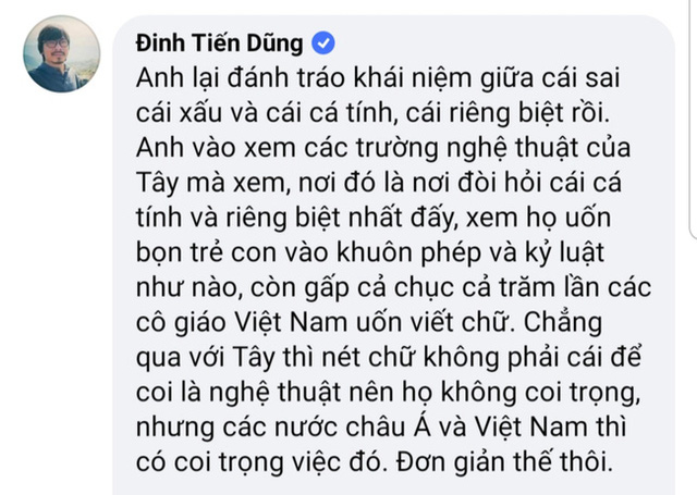 "Việc quan niệm xưa về "nét chữ nết người" đã in đậm quá sâu trong tiềm thức nhiều người, khiến họ cho rằng, chữ là con người. Điều đó sai, và tôi phản bác lại quan điểm đó. Một đứa trẻ lớn lên phải là tổng hoà của nhiều yếu tố. Nó không chỉ khoẻ mạnh về thể chất mà còn phải tự lập, có thể không ngại nói lên suy nghĩ và quan điểm của mình (bất luận đúng sai tính sau) và được rèn về kĩ năng sống từ khi còn nhỏ.