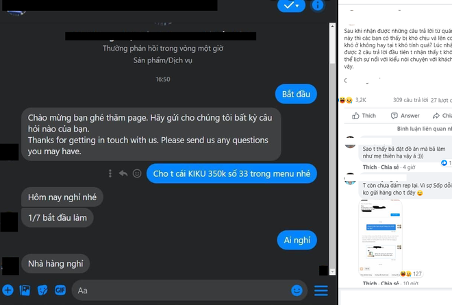 "Khách mua đồ ăn mà bắt năn nỉ nhà hàng bán hay gì mà trả lời kiểu thiếu lịch sự như vậy. Thấy khách nhắn vậy bình thường, còn những cách nói khác mà 1 người làm dịch vụ phải nhịn".