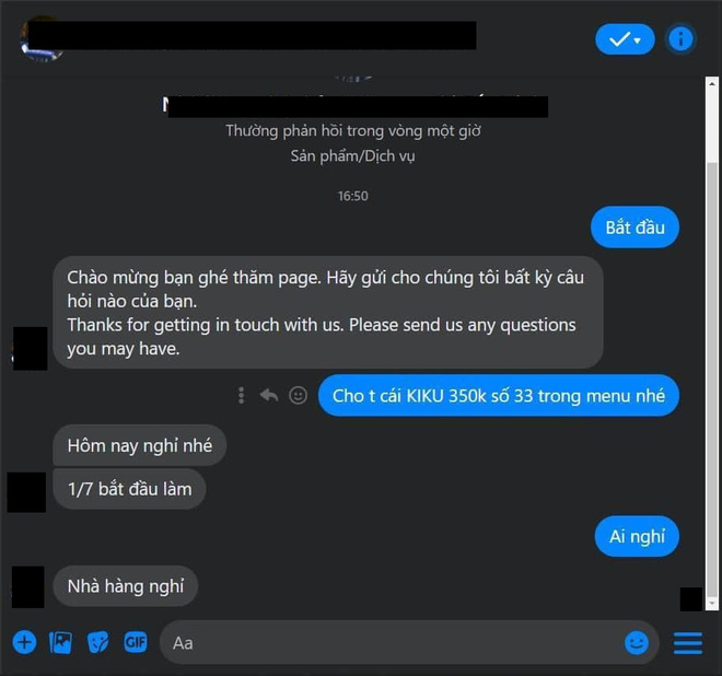 Theo đó, cô gái này đã có trải nghiệm khá tệ khi nói chuyện với người quản lý fanpage nhà hàng. Cô muốn mua 1 phần ăn sushi có giá 350k. Đáp lại khách, nhà hàng chỉ trả lời ngắn gọn: "Hôm nay nghỉ nhé. 1//7 bắt đầu làm".
