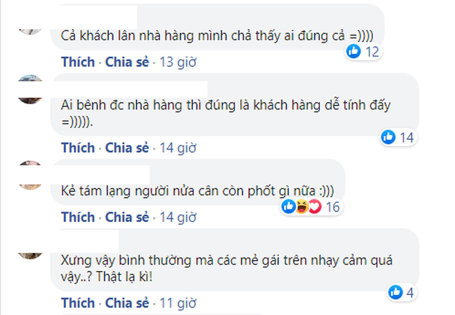 "Không thể nói ai đúng ai sai. Chỉ thấy chủ bài viết trẻ con quá. Quan trọng đồ ăn của quán có ngon không, chất lượng không và khi bạn đến quán, trải nghiệm dịch vụ có hài lòng không. Chứ mấy câu nói vu vơ thế này cũng chấp nhặt đăng lên mạng xã hội. Bạn bị chửi bạn không mất gì nhưng nhà hàng gặp phốt sẽ thiệt đủ đường!".