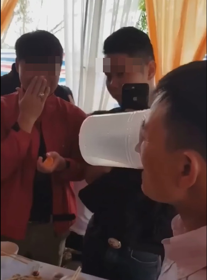 Trên bàn tiệc cưới, bố cô dâu cũng tham gia nhiệt tình bằng cách một mình xử lý lần lượt 3 ca (mỗi ca 0,5 lít) rượu trước sự ngỡ ngàng của những người có mặt. Ông cứ thế tu từng can, còn nhóm thanh niên đứng xung quanh không ngừng hò hét, cổ vũ. Có lẽ nhà trai cũng phải "xanh mặt", bái phục trước khả năng của bố cô dâu.