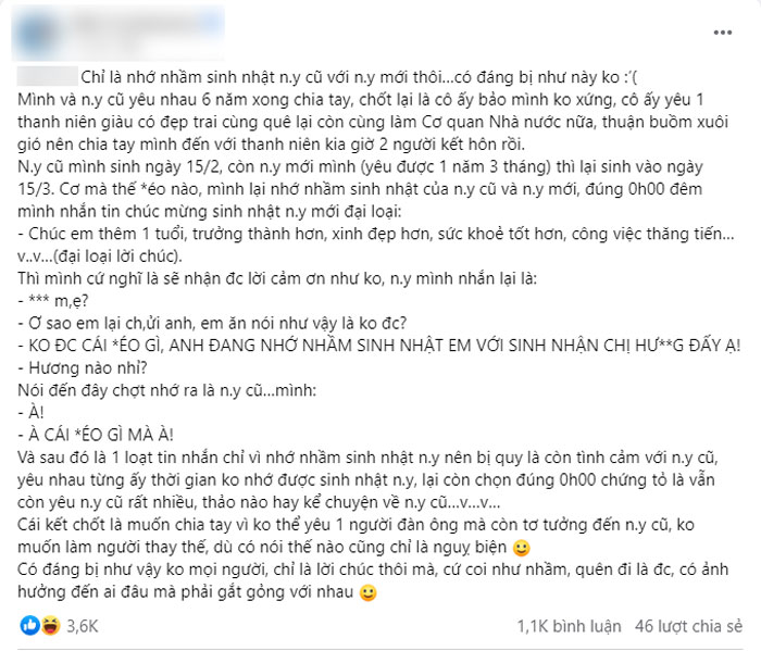 "Chỉ là nhớ nhầm sinh nhật người yêu cũ với người yêu mới thôi. Có đáng bị như này không?
