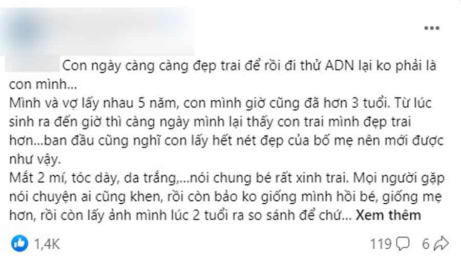 "Mình và vợ lấy nhau 5 năm, con mình giờ cũng đã hơn 3 tuổi. Từ lúc sinh ra đến giờ thì càng ngày mình lại thấy con trai mình đẹp trai hơn… ban đầu cũng nghĩ con lấy hết nét đẹp của bố mẹ nên mới được như vậy.