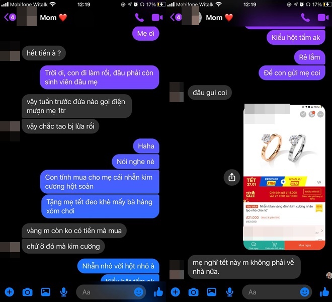 22/01/2021 22:08Nhắn tin báo sẽ mua nhẫn kim cương tặng mẹ, thanh niên bị mắng 'không cần về Tết' sau khi lộ giá tiền