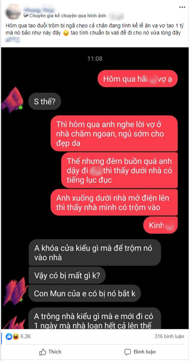 Một phần vì hoảng hốt, một phần cũng muốn nhõng nhẽo với vợ chút để được thương nên anh chàng nhắn tin kể lại cho vợ nghe. Nhưng còn chưa kịp nói đến phần thương tích, anh chàng đã bị vợ xả cho 1 trận: "Anh khóa cửa kiểu gì mà để trộm vào nhà? Vậy có mất gì không? Con Mun của em có bị bắt không? Anh trông nhà kiểu gì mà em mới đi có 1 ngày nhà đã loạn hết lên thế?".