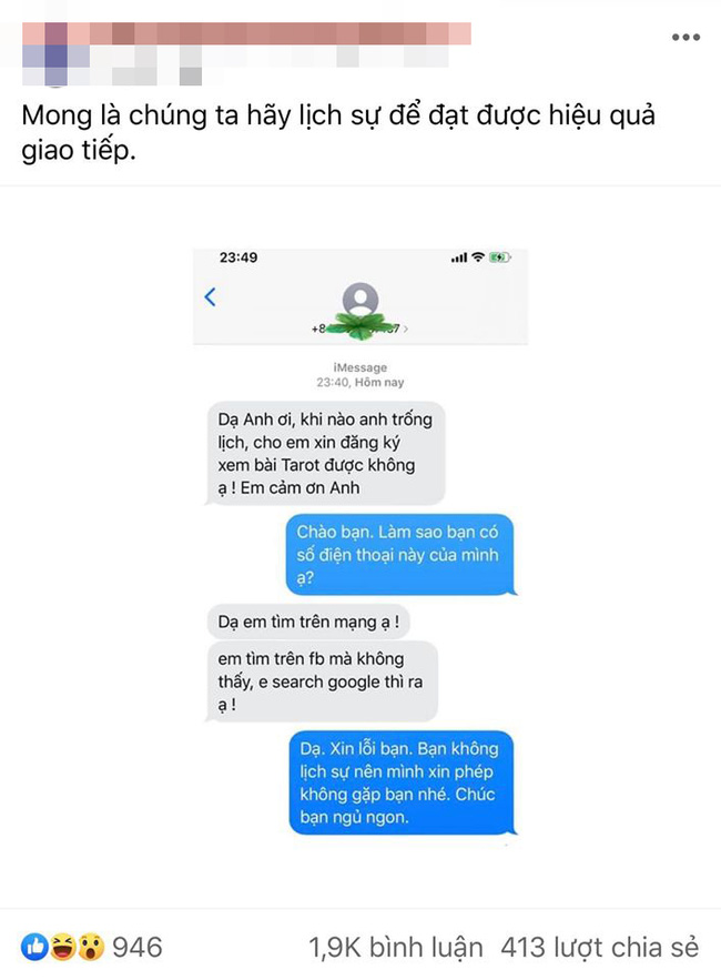 Cụ thể cô gái nhắn tin muốn xếp lịch để được chàng thanh niên xem bài, tuy nhiên sau khi trả lời câu hỏi vì sao biết đến số điện thoại này thì ngay lập tức chàng thanh niên đã từ chối xem bài do cô gái không lịch sự.
