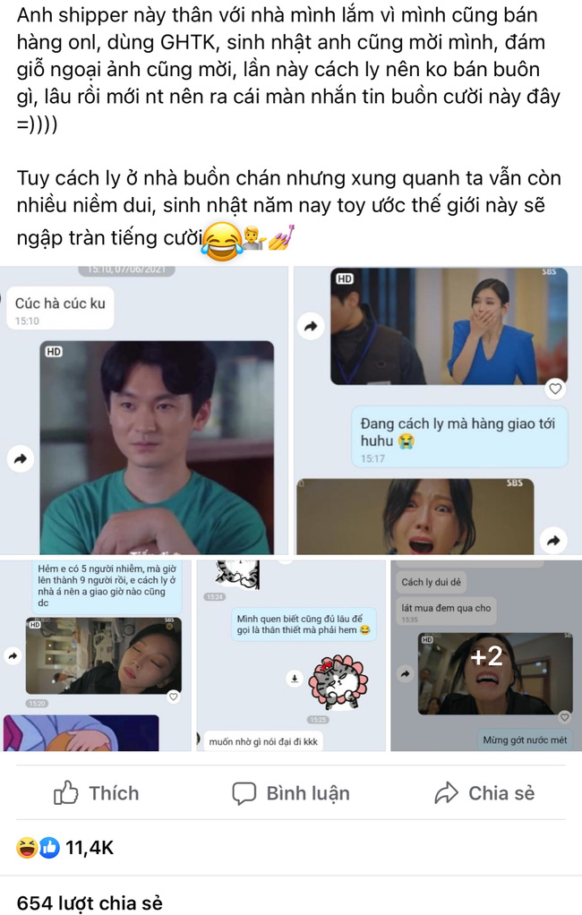"Chuyện là mình mua mấy đơn hàng linh tinh cách đây nửa tháng rồi giờ mới ship đến do hàng order TQ, ngay lúc mình bị cách ly tại nhà luôn.